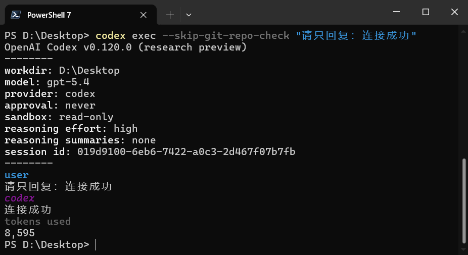 codex exec --skip-git-repo-check "请只回复:连接成功"成功标准